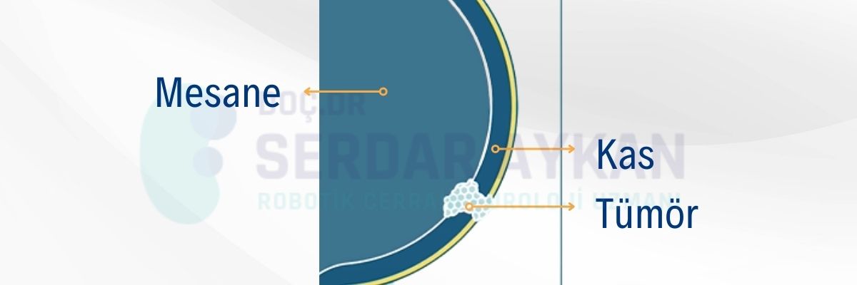 Mesane kanseri, mesane tabakasında mukoza adı verilen hücrelerin kontrolsüz bir şekilde çoğalması sonucu gelişir. Mesane tümörü zaman içinde büyüyebilir, mesane içine yayılabilir. Kanser erken aşamada yani henüz yüzeyel haldeyken (mukoza ile sınırlıyken) yakalanırsa hastaya TUR ameliyatı uygulanabilir. Tümör lokalize olarak mesaneden çıkarılabilir. Mesane kanseri tekrarlayabilir. Tekrarlayan tümör kasa yayılmamışsa hastaya yine TUR ameliyatı yapılabilir. Burada önemli olan konu tümörün kas tabakasına yayılıp yayılmadığıdır. Aşağıdaki görselde gösterildiği gibi tümörün kasa geçtiği olgularda (derin mesane tümörü) TUR uygulanamaz. Bu durumda TUR’a göre çok daha büyük bir ameliyat olan radikal sistektomi yani mesanenin tamamen çıkarılması ameliyatına başvurmak gerekir. Bu ameliyattan sonra hastaya yeni bir mesane yapmak gerekir. Öte yandan mesane tümörü kemik ya da farklı bir organa metastaz yapabilir. Bu durumda sistemik tedavilere de başvurmak gerekecektir.